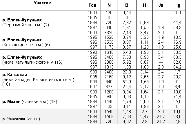 | Устье р. Еллен-Кулуньях (7) | 1520 | 11,752 | 9/8 | 3,27 | 1,9 | 18,4 |