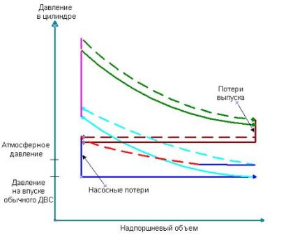 Рассмотрим обычный способ работы ДВС (сплошная линия). Розовым цветом обозначен процесс горения, когда происходит вспышка рабочей смеси и давление газов в цилиндре резко возрастают. Затем начинается рабочий ход (зеленая линия). Газы, расширяясь, толкают поршень вниз. При этом увеличивается объем над поршнем и одновременно падает давление газов. Закончился рабочий ход и открылся выпускной клапан, выпуская на волю отработавшие газы (коричневая линия). У них, правда, осталось кое-какое остаточное давление, но использовать его не получится — это потери выпуска. Далее поршень идет вверх, вытесняя отработавшие газы. В конце такта выпуска, закрылся выпускной клапан и открылся впускной, сообщая цилиндр с карбюратором. Начинается такт впуска (синяя линия), поршень перемещается вниз и всасывает топливовоздушную смесь. Причем педаль газа сейчас не нажата до упора (переходной режим), дроссельная заслонка прикрыта и создает сопротивление на впуске, заставляя двигатель тратить энергию на так называемые насосные потери. Закрылся впускной клапан и начинается такт сжатия (голубая линия), при котором увеличивается давление в надпоршневом объеме. По окончании такта сжатия начинается процесс горения (розовая линия), и так далее.