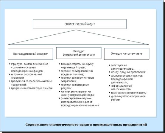 Около 30 лет назад в странах с рыночной экономикой организационная схема хозяйственно-финансового контроля была дополнена введением экологического аудита. В международной практике экологический аудит реализован в практический механизм деятельности, основанной на законодательной и нормативно-методической базе, имеет развитую организационную инфраструктуру и оснащен квалифицированными кадрами экоаудиторов. В США, Японии, в странах Европейского Союза процедура экологического аудита направлена на повышение эффективности экологической политики компаний или промышленных предприятий.