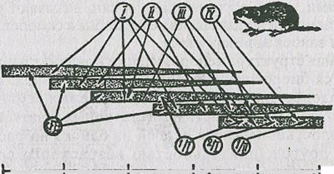 В сокращающихся популяциях преобладают старые особи, которые уже не способны интенсивно размножаться. Данная возрастная структура свидетельствует о неблагоприятных условиях. В быстро растущих популяциях преобладают интенсивно размножающиеся молодые особи. В стабильных популяциях это соотношение, как правило, составляет 1:1. При благоприятных условиях в популяции имеются все возрастные группы и поддерживается сравнительно стабильный уровень численности. На возрастной состав популяции, помимо общей продолжительности жизни, влияют длительность периода размножения, число генераций в сезон, плодовитость и смертность разных возрастных групп. Так, у полевок (Clethrionomys) взрослые особи могут давать потомство три раза в год и более, а молодые особи способны размножаться через 2—3 месяца (рис. 4).