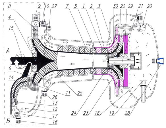1 - сужающееся реактивное сопло; 2 - эжекторный насадок - устройство присоединения дополнительных масс эжекторного соплового аппарата; 3 - первая турбина силового вала; 4 - вторая турбина силового вала; 5 - силовой вал; 6 - центробежный компрессор силового вала; 7 - осевой компрессор силового вала; 8 - центробежный диффузор; 9 - выпускной пневмоклапан; 10 - пневмоклапан; 11 - направляющий аппарат; 12 - объём вихревой камеры – низкотемпературного теплоприёмника; 13 - направляющий аппарат на входе второй ступени турбины 4; 14 - лопатки второй ступени турбины 4; 15 - направляющий аппарат на входе компрессора 6; 16 - выпускной пневмоклапан; 17 - пневмоклапан; 18 - пневмоаккумулятор рабочего тела; 19 - обратный клапан для подачи рабочего тела, сжатого внешними устройствами; 20 - обратный клапан для подачи рабочего тела, сжатого в компрессоре двигателя; 21 - электромагнитный клапан для периодической подачи рабочего тела; 22 - турбинные лопатки - направляющий аппарат на входе в турбину 3; 23 - турбинные лопатки турбины 3; 24 - направляющий аппарат на выходе турбины 3; 25 - лопатки первой ступени турбины 4; 26, 27 - клапаны впускные; 28 - реактивное сопло; 29 – турбина, не закреплённая на силовом валу; 30 - компрессор, кинематически не связанный с силовым валом.