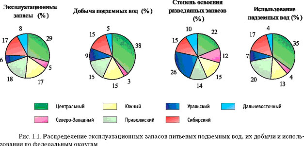 На территории Российской Федерации разведано 4483 месторождения подземных вод, в эксплуатации находится 1990. Общее количество разведанных эксплуатационных запасов под земных вод, пригодных для хозяйственно-питьевого, производственно-технического водоснабжения, орошения земель и обводнения пастбищ составляет 89,4 млн. м3 /сут, в том числе подготовленных для промышленного освоения (по категориям А+В+С1) - 80,4 млн. м3 /сут. Общая добыча подземных вод составляет 28,15 млн. м3 /сут, в том числе на участках с разведанными запасами - 15,32 млн. м3 /сут, или 54,4%, на неутвержденных запасах подземных вод - 12,83 млн. м3 /сут.