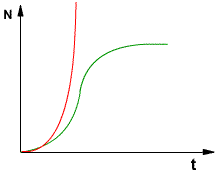 Поэтому в естетсвенных условиях обычно наблюдается иная зависимость численность популяции от времени. Это зависимость описывается S-образной логистической кривой (она изображена на графике зеленой линией). По достижении какого-то предела график выходит на плато, численность стабилизируется и испытывает только сезонные и разногодичные флуктуации, связанные с изменением погодных условий, численности других популяций (являющихся хищниками или, наоборот, пищевыми ресурсами по отношению к данной популяции) и другими внешними факторами.