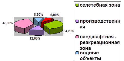 В структуре городской территории34,2 % занимает селитебная зона, 12,6 % - производственная, 37,8 % – лафтшафтно-рекреационные зоны (в.т. садово-огородные участки). 8,5 % - водные объекты, 6,9 % - прочие, в том числе свалки и кладбища. При этом 28,6 % - территория города занято производственно–складскими объектами.