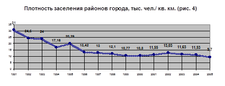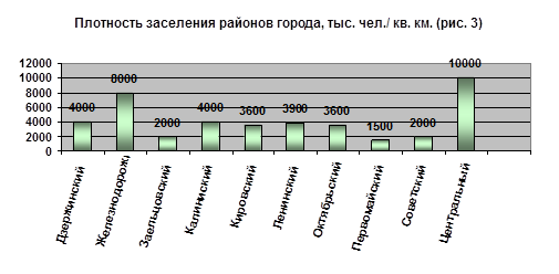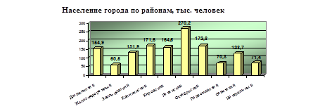 Город поделен на 10 административных районов. Средняя расчетная плотность населения Новосибирска в 2001 году 2786 человек на квадратный километр, на 01.01.2006 г. – 2768 человек. Вместе с тем территория города заселена неравномерно.Можно сформировать 4 группы районов по уровню населения. Наиболее плотно заселен исторический центр города: Центральный и Железнодорожный районы. Ко второй группе отнесены восточные районы города: Калининский, с включенным в его состав поселком Пашино, и Дзержинский. В левобережье, а также в Октябрьском районе, часть которого также расположена в историческом центре города, плотность населения близка к средней по городу. Менее плотно заселены Заельцовский, Советский и Первомайский районы, значительную часть территории которых занимают лесные массивы.Это хорошо видно на диаграмме (см. ниже).