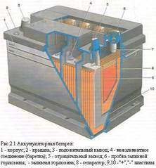 Свинцовый аккумулятор, как обратимый химический источник тока, состоит из блока разноименных электродов, помещенных в сосуд, заполненный электролитом. Стартерная батарея в зависимости от требуемого напряжения содержит несколько последовательно соединенных аккумуляторов. В стартерных батареях собранные в полублоки 3 и 12 (рис 2.1), положительные 15 и отрицательные16 электроды (пластины) аккумуляторов размещены в отдельных ячейках моноблока (корпуса) 2.