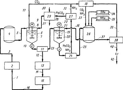 1 — 14, 17—40 (в тексте); 15 — процесс производства аккумуляторных батарей; 16 — сточные воды, загрязненные свинцом и серной кислотой; 41 — кристаллический сульфат аммония; 42 — товарный продукт