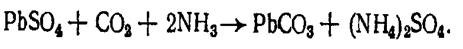 сульфата свинца и последующую фильтрацию для отделения воды от сульфата свинца с возвратом воды в производство. Отфильтрованный сульфат свинца добавляется в раствор аммиака, сульфата аммония, углекислого газа и воды во втором реакторе для образования сульфата аммония и карбоната свинца.