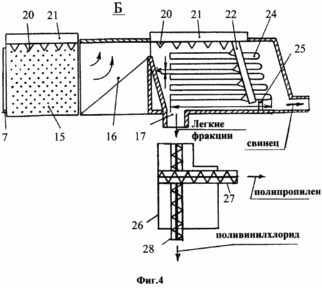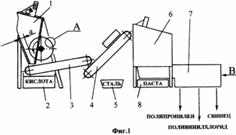 Производство аккумуляторов требует большого количества воды, загрязняющейся в процессе производства свинцом и серной кислотой. Загрязненная вода, содержащая свинец в различных формах и серную кислоту, по трубопроводу 1 подается на фильтр грубой очистки 2. Фильтр предназначен для удаления крупных твердых частиц, например металлического свинца и других соединений. После фильтрации вода содержит серную кислоту и растворенные соединения свинца и по трубопроводу 3 подается в резервуар 4. Поскольку последующий процесс происходит с периодической загрузкой, резервуар позволяет накапливать воду в период питания реактора из другой аналогичной емкости. В соответствующий момент времени выходной трубопровод резервуара 4 подключается к реакционному сосуду о. Реактор 6 может представлять собой большой резервуар с мешалкой 7, связанной через вал 8 с мотором 9. После заполнения реактора 6 водой из емкости 4, порошкообразный карбонат свинца подается в б из бункера 29 и масса интенсивно перемешивается.