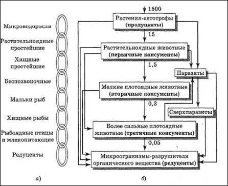 Рис. 1. Пищевые цепи биоценоза по Н.Ф. Реймерсу: обобщенная (а) и реальная (б)