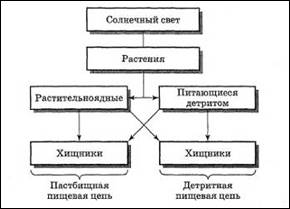 Реальные пищевые связи намного сложнее, ибо животное может питаться организмами разных типов, входящих в одну и ту же пищевую цепь или в различные цепи, что особенно характерно для хищников (консументов) высших трофических уровней. Связь между пастбищной и детритной пищевыми цепями иллюстрирует предложенная Ю. Одумом модель потока энергии (рис. 2)[2] .