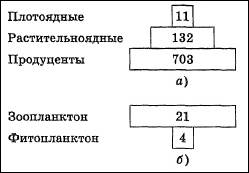 Рис. 5. Пирамиды биомасс биоценозов кораллового рифа (а) и пролива Ла-Манш (б): цифры – биомасса в граммах сухого вещества, приходящегося на 1 м2