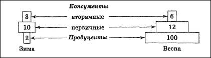 Одним из следствий описанного являются «перевернутые пирамиды» (рис. 3, б). Зоопланктон биоценозов озер и морей чаще всего обладает большей биомассой, чем его пища – фитопланктон, однако скорость размножения зеленых водорослей настолько велика, что в течение суток они восстанавливают всю съеденную зоопланктоном биомассу. Тем не менее в определенные периоды года (во время весеннего цветения) наблюдают обычное соотношение их биомасс (рис. 6)[6] .