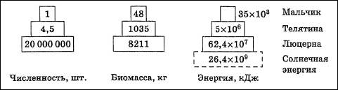 Одним из наиболее удачных и наглядных примеров классических экологических пирамид служат пирамиды, изображенные на рис. 8[8] . Они иллюстрируют условный биоценоз, предложенный американским экологом Ю. Одумом. «Биоценоз» состоит из мальчика, питающегося только телятиной, и телят, которые едят исключительно люцерну.
