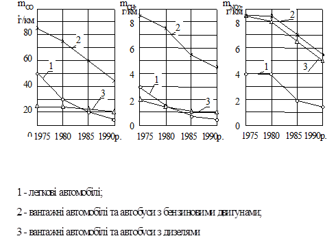Треба відзначити, що для більш глибокого урахування та розуміння ступеня забруднення атмосферного повітря автотранспортом та особливо автомобілями з дизельними двигунами необхідно також знати пробігові викиди з ВГ автомобілей: оксидів сірки (SO2 ), сажових часток (Сж), канцерогенних вуглеводнів, в якості індикатора яких прийнятий бенз(а)пірен (БП), і альдегідів (RCHO). У відповідності до приведених даних раніше, наприклад, питомі пробігові рівні викидів БП з ВГ легкових автомобілей типу ГАЗ-31-029 з бензиновими двигунами складають 8,87*10-6 г/км. З використанням на вказаних автомобілях систем окислювальної чи біфункціональної каталітичної нейтралізації ВГ забезпечується зниження пробігового викиду БП приблизно до 0,5*10-6 г/км, тобто майже в 20 разів. Використанння на автомобілях систем каталітичної нейтралізації ВГ забезпечить також суттєве зниження питомих пробігових рівней викидів альдегідів та сажових часток. Однак, як відмічалося раніше, для надійної роботи нейтралізаторів необхідне використання в автомобілях неетильованих бензинів з гранично низьким вмістом сірки.
