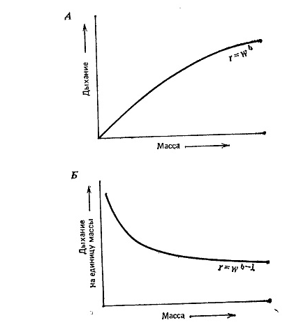 Рис. 3-17. Связь между дыханием и массой тела у одной особи (А) и дыханием на единицу массы и массой тела (Б). Показатель степени в уравнениях обычно лежит в пределах 0,7—0,8. (С изменениями по Agren, Axelsson, 1980.)