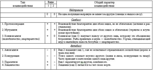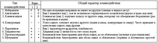 Различают несколько форм межвидовых взаимодействий и несколько классификаций взаимоотношений между видами. Остановимся на двух из них. Если обозначить безразличные для вида взаимоотношения 0, полезные +, а вредные - для партнеров, то все многообразие взаимоотношений можно обозначить: 00, 0+, 0-, ++, +-, - -.
