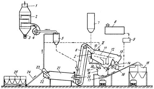 Высушенный и нагретый материал подается элеватором в смеситель, куда из дозатора также поступает битум. В смесительном агрегате происходит сортировка нагретых материалов, их дозировка и перемешивание. Готовая смесь подается в бункер-накопитель для отгрузки на автотранспорт.