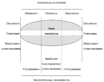 Две точки - минимум и максимум - характеризуют «пороговое» действие фактора, при котором развитие организма или вида идет хуже всего. Этих точек две: одна в области недостаточного, другая в области избыточного значения фактора. Эти точки называют «пессимумом», зоной угнетения. Вся заштрихованная зона - зона жизнедеятельности организма. Наилучшее развитие идет при оптимальной интенсивности фактора (средняя часть). Зона действия фактора - от минимума до максимума - представляет собой экологическую валентность вида.