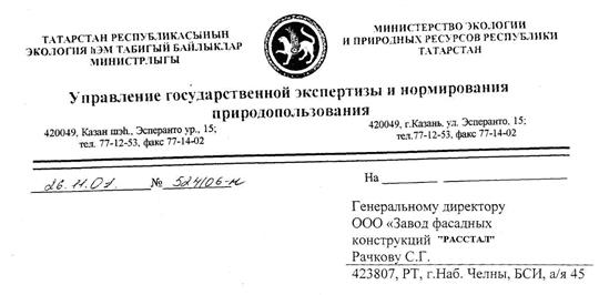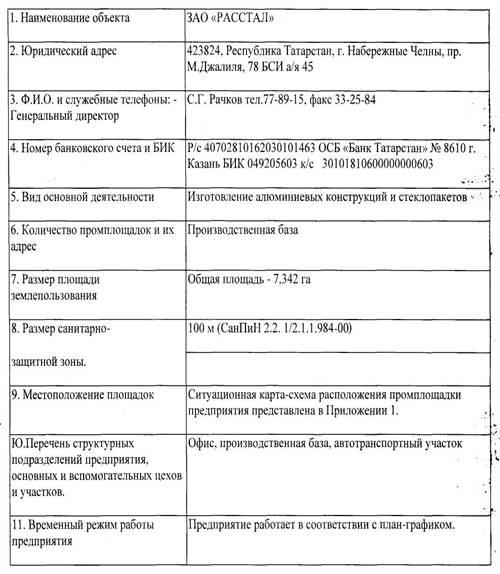 По проведенным исследованиям в ЗАО "РАССТАЛ" на соответствие общим, предъявляемым экологическим требованиям и нормам, а также на осуществление деятельности малоотходных производств, ООО "Бюро экологических исследований" (БЭКИС) вынесло заключение по результатам рассмотрения материалов проекта нормативов образования отходов и лимитов на их размещение. Данные материала отражены в документе (См. Приложение 1).