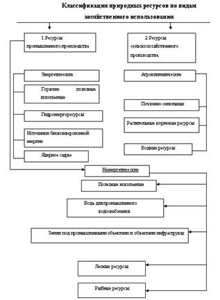 · Среди классификаций природных ресурсов, отражающих их экономическую значимость и хозяйственную роль, особенно часто используется классификация по направлению и видам хозяйственного использования. Основной критерий подразделения ресурсов в ней - отнесение их к различным секторам материального производства или непроизводственной сферы. По этому признаку природные ресурсы делятся на ресурсы промышленного и сельскохозяйственного производства.