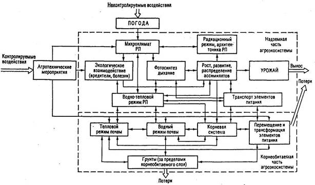 Продукционный процесс агроэкосистемы зависит не от разрозненно действующих абиотических (местоположение, солнечная радиация, тепловой и водный режимы, минеральное питание и др.), биотических и антропогенных факторов, а одновременно от всего их комплекса (результирующий вектор сложных комбинаций межфакторных взаимодействий). Продуктивность агроэкосистемы обеспечивается интенсивностью и направленностью процессов обмена веществ и переноса энергии между возделываемой культурой и окружающей природной средой, находящихся под управлением человека. От качества управления, степени его природосообразности зависит в конечном итоге экосистемный уровень биологической организации агроэкосистем.