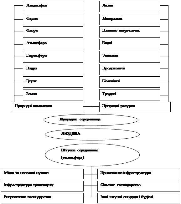 Середовище, яке оточує людину, формувалось мільйони років. Воно складається із штучного середовища, створеного людьми в процесі розвитку (господарсько-побутової, промислової, транспортної, енергетичної та інших інфраструктур); природного середовища, яке утворилось в процесі еволюційного формування Землі й життя на ній; природних ресурсів, без яких неможливе існування та розвиток суспільства (рис. 1.1).