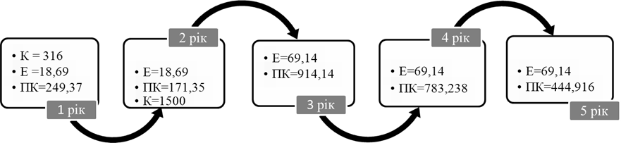 ПК5 = (158 – 6,69 – 12 – 50,45) × 1,23 = 109,298 тис. грн.