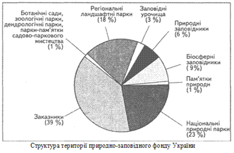 У природно-заповідний фонд України входять заповідники, заказники, регіональні ландшафтні парки, заповідні урочища, ботанічні сади, зоологічні, дендрологічні парки, пам'ятки садово-паркового мистецтва тощо. Загалом природно-заповідний фонд України в 2008 р. налічував у своєму складі 6939 територій і об'єктів площею 2508,7 тис. га, що становить 4,16 % території країни [14, 106].