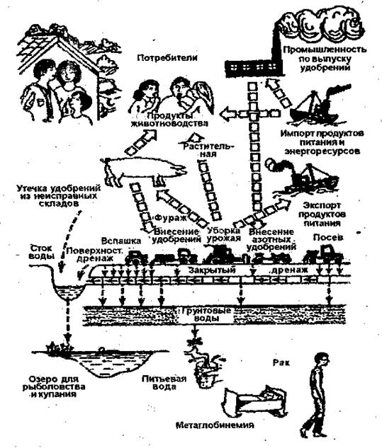 Промышленный синтез азотных удобрений и их рассеивание по поверхности земли вносит серьезные изменения в его биогеохимический круговорот. Увеличение количества азота в природных средах за счет деятельности человека — опасное явление, так как вводимые в избытке нитраты не полностью денитрифицируются, а отсюда равновесие между процессами нитрификации и денитрификации нарушается. Ежегодно избыток нитратов достигает 9 млн. тонн. Они аккумулируются в гидросфере, растениях, а в дальней в пищевых продуктах, вызывают тяжелое отравление (рис. 1.1).