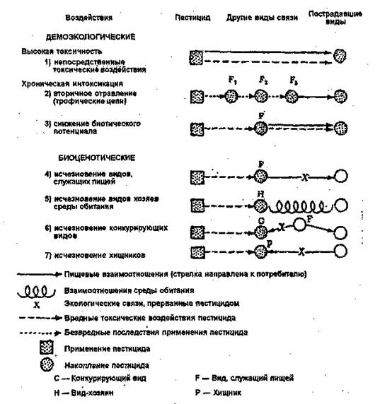 Хроническая интоксикация может изменить коэффициент рождаемости либо путем снижения обычной плодовитости или снижения выживаемости яиц и молодняка, либо в связи с действием указанных факторов одновременно. Эти отрицательные влияния сказываются на биотическом потенциале и в худшем случае могут привести к полной бесплодности популяции, подвергшейся интоксикации. Наряду с демэкологическими воздействиями пестицидов различают и биоценотические воздействия. Так, если какое-то животное абсолютно нечувствительно к данному пестициду, все же численность его популяции может значительно уменьшиться из-за уничтожения тех растений или животных, которые служат ему добычей или пищей. С другой стороны, разрушение гербицидами растения-хозяина исключает из экосистемы тех насекомых и других беспозвоночных, для которых это растение служило пристанищем и на котором они паразитировали.