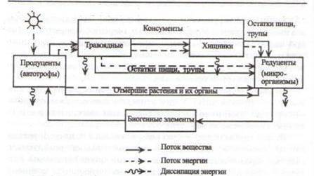Организмы в природе связаны общностью энергии и питательных веществ. Всю экосистему можно уподобить единому механизму, потребляющему энергию и питательные вещества для совершения работы. Питательные вещества первоначально происходят из абиотического компонента системы, в который, в конце концов, и возвращаются либо в качестве отходов жизнедеятельности, либо после гибели и разрушения организмов.