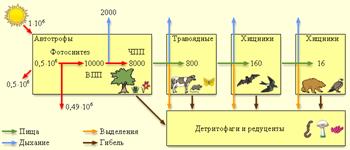 Если заяц съел 10 кг растительной массы, то его собственная масса может увеличиться на 1 кг. Лисица или волк, поедая 1 кг зайчатины, увеличивают свою массу уже только на 100 г. У древесных растений эта доля много ниже из-за того, что древесина плохо усваивается организмами. Для трав и морских водорослей эта величина значительно больше, поскольку у них отсутствуют трудноусвояемые ткани. Однако общая закономерность процесса передачи энергии остается: через верхние трофические уровни ее проходит значительно меньше, чем через нижние.