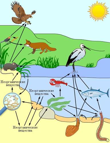Цепи питания пресного водоема состоят из нескольких последовательных звеньев. Например, растительными остатками и развивающимися на них бактериями питаются простейшие, которых поедают мелкие рачки. Рачки, в свою очередь, служат пищей рыбам, а последних могут поедать хищные рыбы. Почти все виды питаются не одним типом пищи, а используют разные пищевые объекты. Пищевые цепи сложно переплетены. Отсюда следует важный общий вывод: если какой-нибудь член биогеоценоза выпадает, то система не нарушается, так как используются другие источники пищи. Чем больше видовое разнообразие, тем система устойчивее.