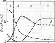 Рис.8. Динамика образования газов на свалках в массе мусора: 1 — метан, 2 — диоксид углерода, 3— азот 4 — кислород, фазы: / — аэробная, // -- анаэробная, не образующая метана, /// — нарастающая анаэробная, метанобразующая, IV - стационарная анаэробная, метанобразующая |