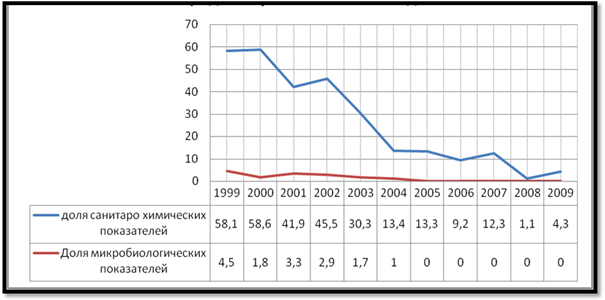 Рис. 9 Кол-во колодцев с несоответствующей санитарным нормам водой (в %) за период 1999 – 2009гг.