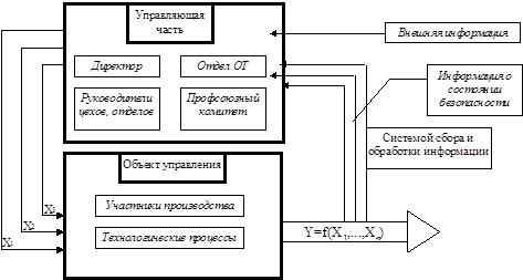 Состояние объектов управления определяется входными параметрами - факторами, воздействующими на безопасность трудовой деятельности (X1 ,...,Xn ). К ним можно отнести безопасность конструкций, безопасность технологических процессов, гигиенические параметры производственной среды и социально-психологические факторы. Так как реальные производственные условия не являются абсолютно безопасными, то выходной характеристикой системы служит некоторый уровень безопасности (Y=f(X1 ,...,Xn )). Выходы объектов управления связаны через систему сбора и обработки информации со входами управляющей части. Информация о выявленных в процессе контроля отклонениях от нормальной безопасности труда, потенциально опасных факторах, поступает в управляющий орган для анализа и принятия решений, направленных на регулирование управляющих параметров входов объекта управления. Таким образом СУБТ действуют по принципу обратной связи и при этом осуществляется замкнутое автономное управление. СУБТ - элемент системы управления более высокого порядка (министерство народного хозяйства). Поэтому на входе управляющей системы поступает внешняя информация: законодательная, директивная, нормативная.