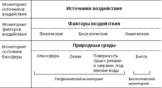 Система экологического мониторинга должна накапливать, систематизировать и анализировать информацию о: - состоянии окружающей среды; - причинах наблюдаемых и вероятных изменений состояния (т. e. об источниках и факторах воздействия); - допустимости изменений и нагрузок на среду в целом; - существующих резервах биосферы. Таким образом, в систему экологического мониторинга входят наблюдения за состоянием элементов биосферы и наблюдения за источниками и факторами антропогенного воздействия.В соответствии с приведенными определениями и возложенными на систему функциями мониторинг включает три основных направления деятельности: - наблюдения за факторами воздействия и состоянием среды; - оценку фактического состояния среды; - прогноз состояния окружающей природной среды и оценку прогнозируемого состояния. Сама система мониторинга не включает деятельность по управлению качеством среды, но является источником необходимой для принятия экологически значимых решений информации (Чупахин В. М., 1989).Существуют различные подходы к классификации мониторинга (по характеру решаемых задач, по уровням организации, по природным средам, за которыми ведутся наблюдения). Отраженная на рис.2 классификация охватывает весь блок экологического мониторинга, наблюдения за меняющейся абиотической составляющей биосферы и ответной реакцией экосистем на эти изменения. Таким образом, экологический мониторинг включает как геофизические, так и биологические аспекты, что определяет широкий спектр методов и приемов исследований, используемых при его осуществлении.