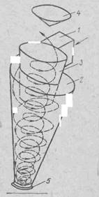 На рис. 1.1 показано устройство конического циклона, который состоит из входного патрубка 1, наружного полого усеченного конуса 2, внутреннего полого усеченного конуса 3, дождевого колпака с рассекателем 4 и пылевого патрубка 5. Запыленный воздух поступает в циклон через входной патрубок по касательной и приобретает вращательное движение. Центробежная сила отжимает частицы пыли к внутренней стенке наружного конуса, по которой они, вращаясь, скатываются к пылевому патрубку и выводятся в атмосферу. Воздушный поток, также вращаясь и теряя скорость, в нижней части переходит во внутренний конус и выходит в атмосферу. В нижней части циклона, в месте перехода наружного воздушного потока во внутренний конус, создается разрежение, которое препятствует выделению пыли. В результате этого разрежения через пылевой патрубок в циклон подсасывается наружный воздух, а вместе с ним может обратно поступать выделенная пыль, которая будет выбрасываться в атмосферу через внутренний усеченный конус вместе с очищенным воздухом.