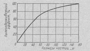 На графике (рис. 1.2) показана зависимость пылезадерживающего эффекта циклона от размера частиц пыли, выделяющейся с отработавшим воздухом пневмотранспортной установки с крупностью частиц менее 50|х и содержанием их в пыли около 35%. Пылезадерживающий эффект при этом составляет 60—65%. Опыт работы хлопкоочистительных заводов показывает, что при очистке циклонами отработавшего воздуха с большим содержанием в нем волокнистой массы пылезадерживающий эффект доходит до 94-97%. Это объясняется тем, что пыль с воздухом по внутренней поверхности наружного конуса опускается, а вблизи пылевого патрубка воздушный поток изменяет направление. В момент изменения направления движения воздушного потока происходит захват воздухом мелких частиц пыли и вынос их из циклона в атмосферу.