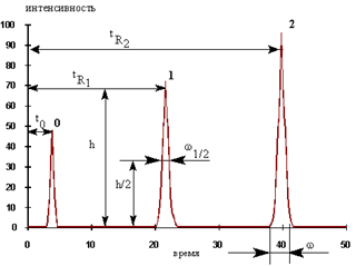 Время удерживанияtR - это время, прошедшее от момента ввода пробы в колонку до выхода максимума соответствующего пика. Умножив время удерживания на объемную скорость элюента F
