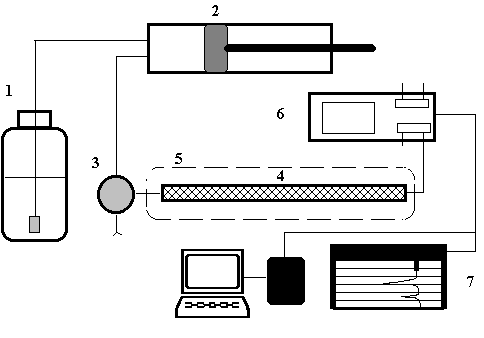 Инжектор (3) обеспечивает ввод пробы смеси разделяемых компонентов в колонку с достаточно высокой воспроизводимостью. Простые системы ввода пробы - "stop-flow" требуют остановки насоса и, поэтому, менее удобны, чем петлевые дозаторы, разработанные фирмой Reodyne.