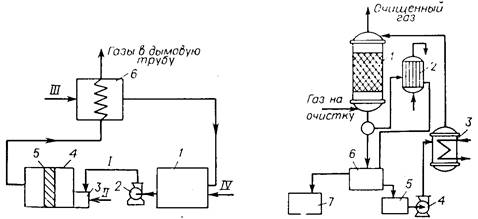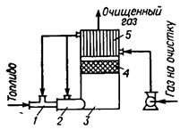 С целью экономии энергоресурсов представляется перспективным возвращать прошедший систему газоочистки воздух (если обезвреживание его производится термическим методом) в производственное помещение, что способствует снижению затрат на его подогрев в зимнее время. О размерах экономии вследствие использования газооборотных циклов можно судить по следующему примеру. При температуре окружающего воздуха 5 °С и температуре очищенного воздуха 25 °С поток, циркулирующий со скоростью 2-104 м/ч, даст экономию электроэнергии 11,8-106 кВт-ч/год