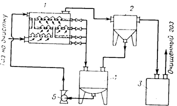Рис. 3. Технологическая схема пылеулавливании в производстве эмульcионного полистирола: 1 — пылеуловитель; 2 — влагоотделитель: 3 - приемник пастообразной суспензии полистирола; 4 — промежуточный сборник; 5 — насос.