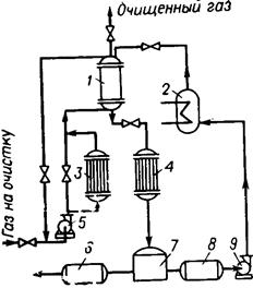 Рис. 4. Технологическая схема очистки газовых выбросов производства АБС-пластиков блочным методом: 1 — адсорбер; 2 — парогенератор; 3 — калорифер-холодильник; 4 — холодильник; 5 — газодувка; 6 — сборник органического слоя; 7 — сепаратор; 8 — сборник водного слоя; 9 — насос.