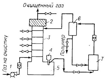 Абсорбционно-полимеризационная очистка позволяет осуществить улавливание вредных веществ без снижения относительной влажности отходящих газов и исключает ректификационную стадию после сбора конденсата. На рис. 5 приведена принципиальная технологическая схема абсорбционно-полимеризационной очистки стирол-содержащих газов.