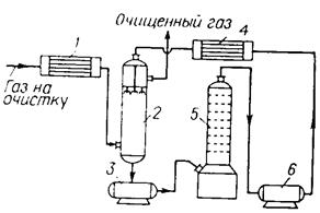 Рис. 7. Принципиальная схема рскуперационной установки: 1, 5 — газодувки; 2 — адсорбер; 3 — холодильник; 4 — декантатор; 6 — калорифер.
