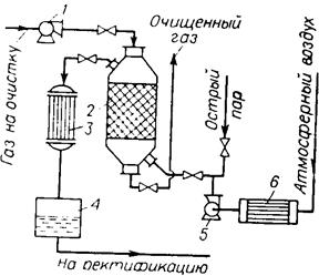 Парогазовая смесь с помощью газодувки 1 направляется в адсорбер 2, где проходит через неподвижный слой активного угля высотой не менее 0,6 м. Для целей рекуперации паров органических веществ отечественная промышленность выпускает угли марок АР-А, АР-Б, АР-В. Очищенный воздух, пройдя через слой активного угля, выбрасывается в атмосферу. После насыщения угля парами летучих веществ подача паровоздушной смеси в адсорбер прекращается, и начинается процесс десорбции.