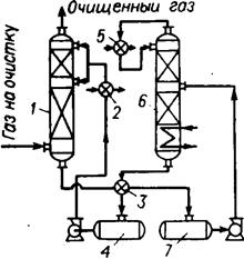1 — газодувка; 2 — брызгоуловитель; 3 — абсорбционная колонна; 4 — плунжерный насос; 5 — емкость для абсорбента; 6 — разделительный сосуд: 7 — емкость с серной кислотой.