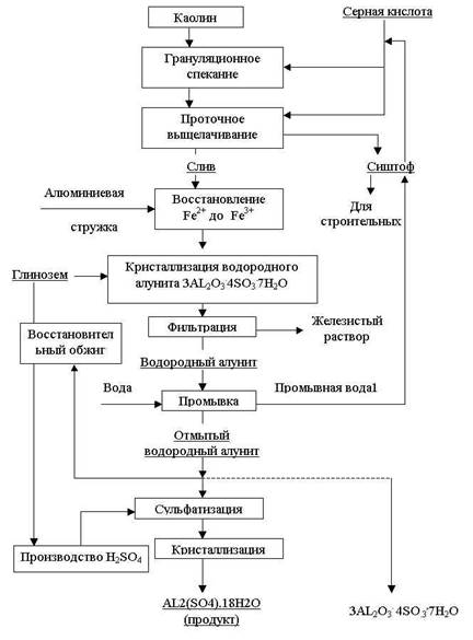 Из рассмотренных ранее способов получения сульфата алюминия следует, что в большинстве из них не решен вопрос глубокой очистки растворов от железа. Между тем в настоящее время в ряде производств к сернокислому алюминию предъявляются жесткие требования по содержанию железа. Сущность способа получения сернокислого алюминия высокой чистоты (рис. 1.2 ) в том, что каолин смешивают с серной кислотой в количестве около 20% и промывной водой 2%. Пульпу подвергают грануляционному спеканию при температуре 200-230 С и обжигу при 560-580 С в печах кипящего слоя. Обожженные гранулы разлагаются в барабанных аппаратах противоточного типа непрерывного действия. Слив поступает на контрольную фильтрацию и затем на восстановление сульфата трехвалентного железа до двухвалентного алюминиевой стужкой при 98-100 С. Из сернокислого раствора в автоклавах кристаллизуют водородный алунит при 230 С в течение 1ч в присутствии восстановленного водородного алунита, который подается в количестве 60-65% от имеющегося в растворе глинозема. Восстановительный обжиг проводят при 560-580 С. В качестве восстановителя могут использовать конвертированный природный газ, генераторный газ, пары солярного масла, сера и др. Химизм процесса можно представить суммарной реакцией: